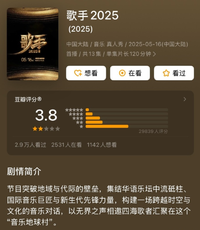 总决赛落幕后,网上发生一件意想不到的事情,《歌手2025》的评分竟从4分跌到现在的3.8分,创开播十三年豆瓣评分最低记录,我们可以发现,本季的揭榜和踢馆歌手,与上季相比确实差距很大,正因如此,李佳薇和黄丽玲才会回来,结果总决赛,黄丽玲倒数第一。