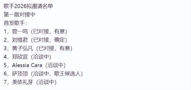 这样的情况出现,网友们开始为黄丽玲鸣不平,需要的时候就给第一名,不需要的时候就倒数第一,下一季节目,还会有专业的歌手来参与录制吗?近日,网上突然传出《歌手2025》拟邀名单,接下来,我们一起看一看: