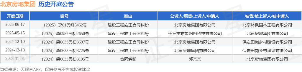 案号:(2025)京01民终5462号审理法院:北京市第一中级人民法院案由:建设工程施工合同纠纷当事人信息: 原告/上诉人:北京房地集团有限公司 被告/被上诉人:北京沐枫园林工程有限公司开庭日期:2025年6月17日根据统计,近一年内以北京房地集团有限公司为当事人的历史开庭公告有5则,其中案由为“建设工程施工合同纠纷”的公告以4则居首,其次为“合同纠纷”有1则。历史开庭公告如下: